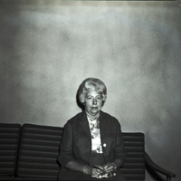 - Mrs. Melvin Sackett, president of the Alpha Delta Kappa Delta Chapter, sits on a couch. She is wearing a jacket, skirt, and floral print blouse.