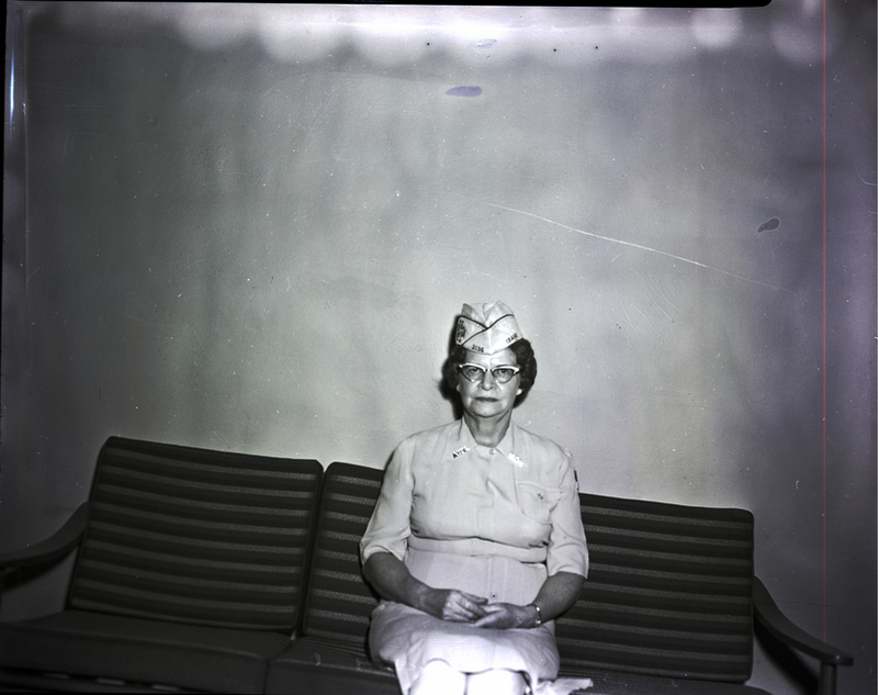 - Mrs. Robert Messenger, president of the Twin Falls Auxiliary to Veterans of Foreign Wars, sits on a couch. She is wearing a Veterans of Foreign Wars Auxiliary uniform dress and cap.