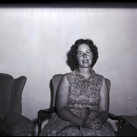 - Mrs. A. R. Robinson, president of the Home Economics in Homemaking, sits on a chair. She is wearing a patterned sleeveless dress. On one side of the chair is a couch, and on the other side is a small stand that has a silver teapot and ash tray on it.