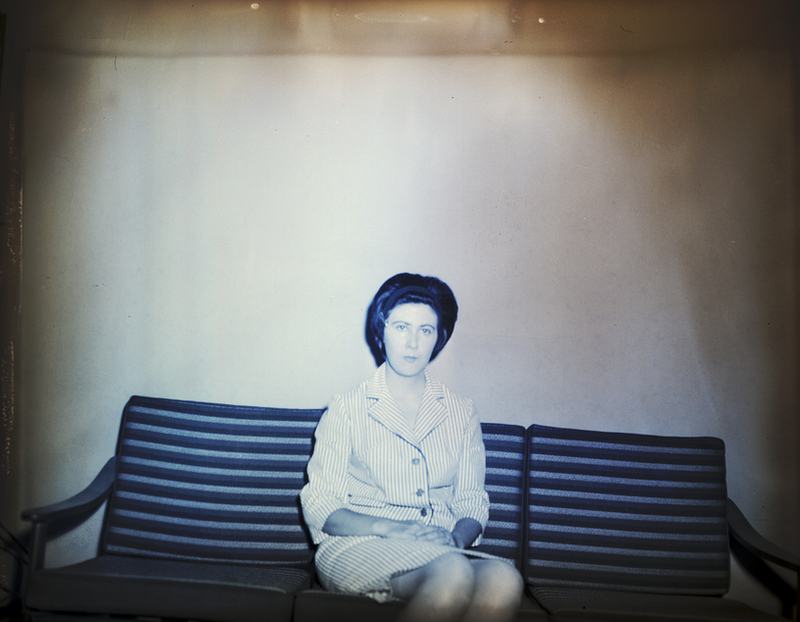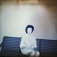 Mrs. D. L. McFarland, president of the Twin Falls Epsilon Sigma Alpha Alpha Nu Chapter, sits on a couch. She is wearing a striped button-up dress.