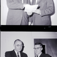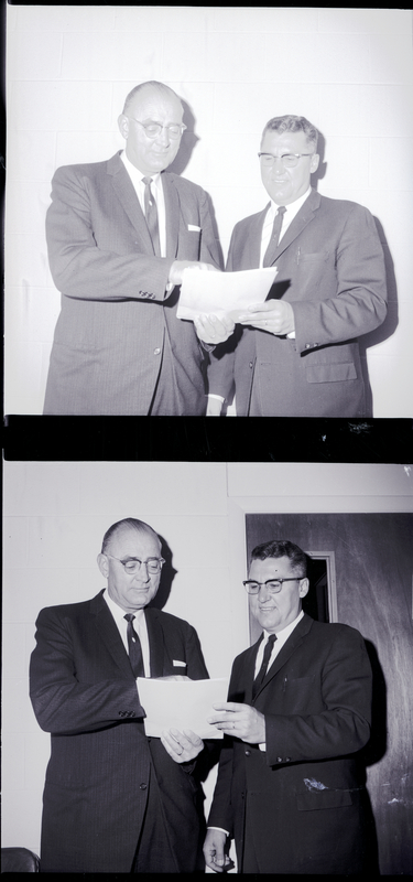 From left to right, Reverend Harold Iben, a new pastor at Immanuel Lutheran Church, and Herbert Einspahr, principal of Memorial Lutheran School, go over some documents on church organizational structure. They are both wearing suits and ties.
