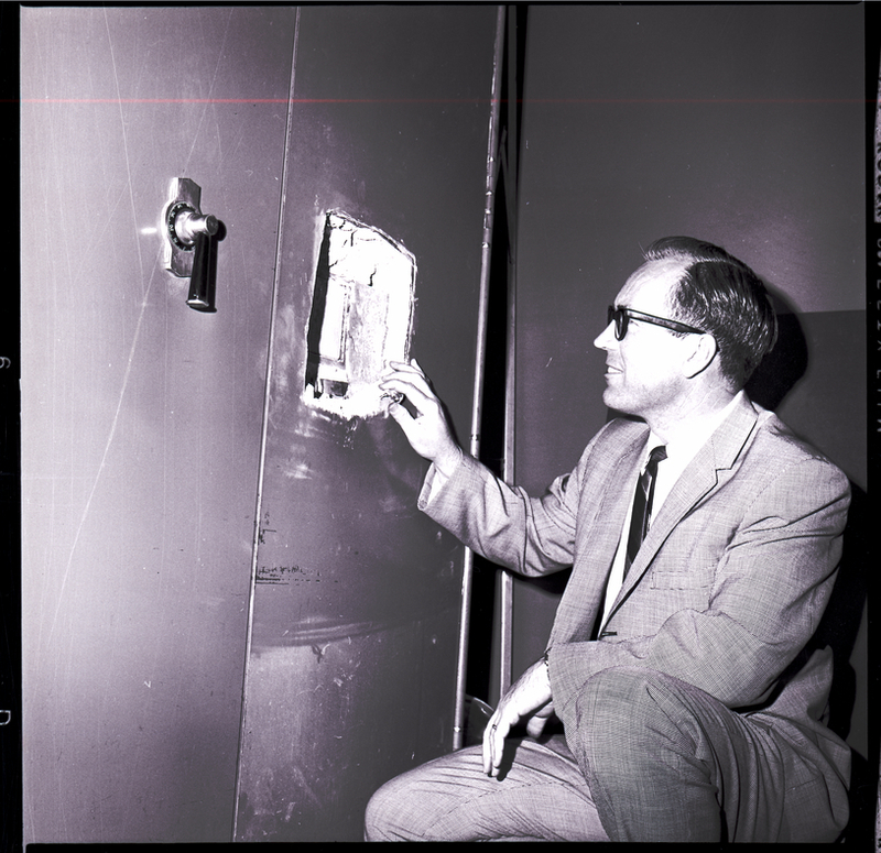 Grant Ousterhout, general manager of Reliance Credit Corp, looks at a hole in a safe door. When employees of the firm couldn't open the safe to get some files by using the combination, and after two locksmiths failed to open it, a power chisel was used. With the help of J. C. Boster, Boster Key Shop, the combination of the safe was cut out with the power chisel. Mr. Ousterhout is dressed in a suit and tie.