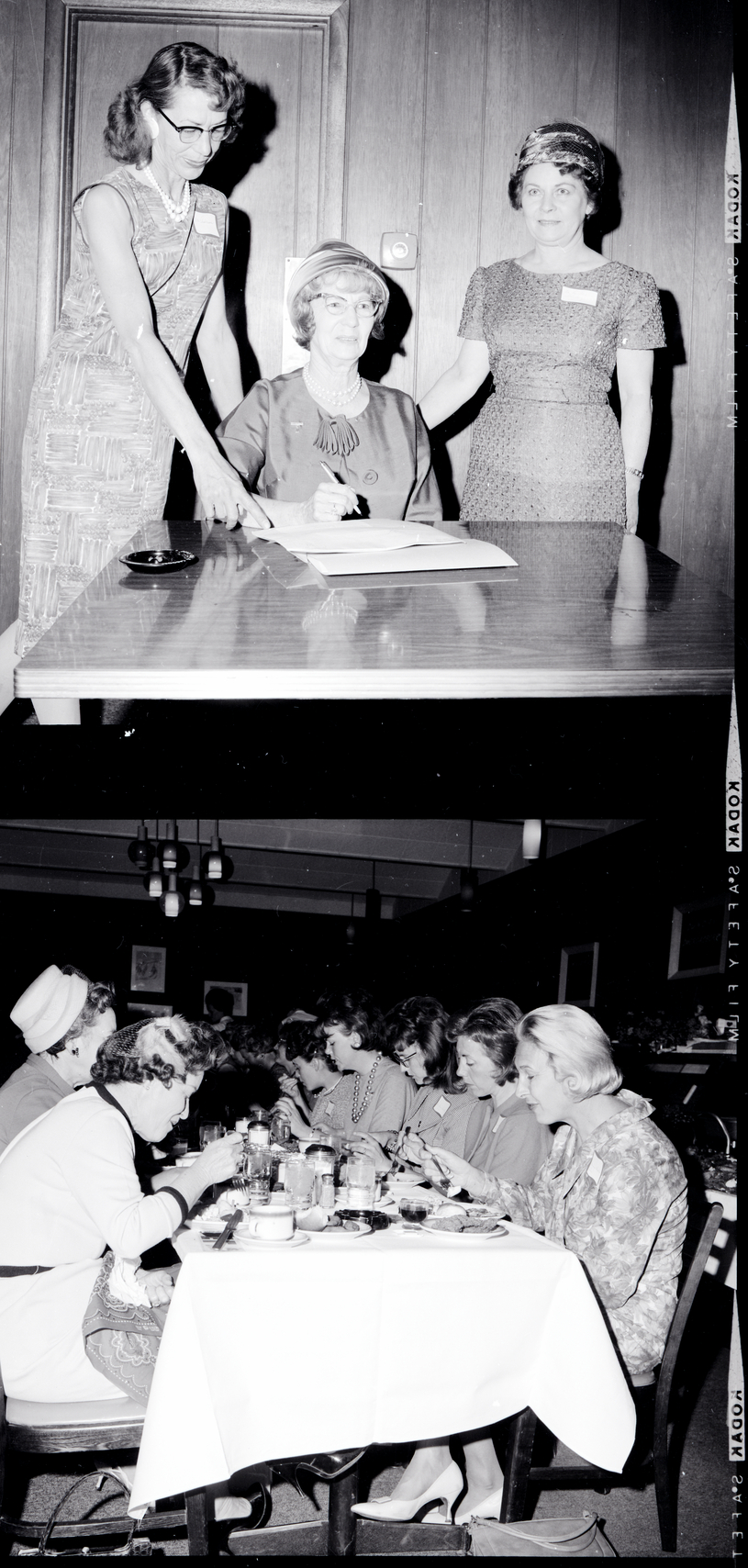 In the top image, checking over the registration list at a Cowbelles organizational meeting are, from left to right, Mrs. Carl G. Anderson, president-elect of the Idaho Cowbelles, Mrs. Robert Stringfellow, treasurer of the Idaho Cowbelles, and Mrs. Roy Mink, president of the
