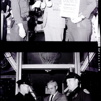 Rudy Ashenbrener buys a ticket to the annual TFPD Policeman's Ball from Patrolman Jerry Packer. Patrolman Gary Bates holds up a sign reading "Annual Policeman's Dance, Legion Hall, November 24, 1965, 9:00 p.m. - 1:00 a.m. Music by the M.C.'s. Admission $1.00." Mr. Ashenbrener is dressed in a suit and tie and the officers are wearing their uniforms. A gymnasium with a basketball hoop overhead is seen in the background.