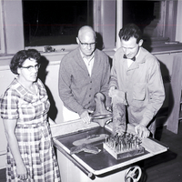 Items and tools used for woodworking and leathercraft are displayed by Mrs. R. O. Jacky and Walter Olson, two enrollees in a Twin Falls Recreation Department-sponsored adult leathercraft and woodworking class. Ray Beaumont, instructor of the course, admires the items. Mrs. Jacky is dressed in a plaid dress, Mr. Olson wears a button-up sweater, and Mr. Beaumont wears a bow tie and work coveralls. On the table is a saw, knives, a leather wallet, a wooden ornament, and a log with the image of an elk carved into it.