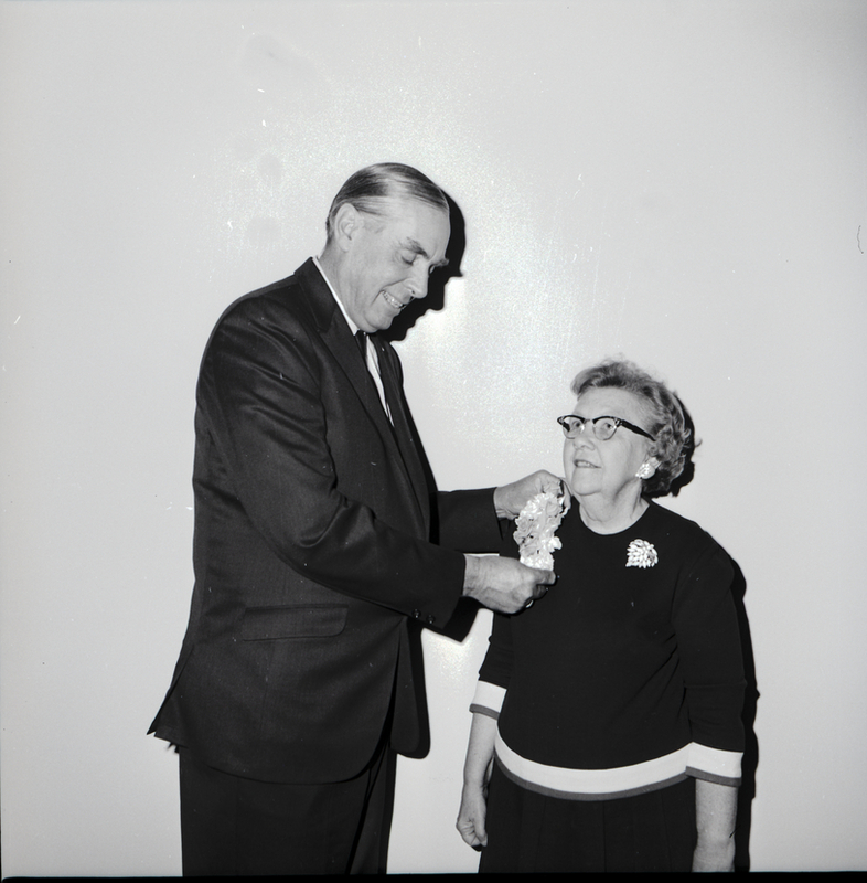 of School District 411, pins a corsage onto Idaho Teacher of the Year Ida Allen, who teaches first grade at Harrison Elementary School in Twin Falls. Mr. Ragland is dressed in a suit and tie and Ms. Allen is wearing a top and skirt. - Date