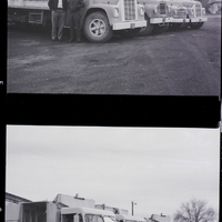 - Harry Knigge, sanitation company foreman, and Chad Thompson, city sanitation inspector, stand beside new garbage trucks owned by the Eldon Corporation. A house and a tree are seen in the background.