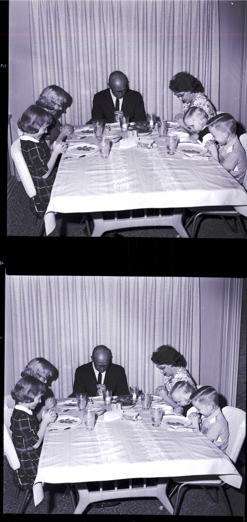 The family of Reverend and Mrs. Eugene Tjarks pray around a dining table during the Thanksgiving holiday. Seated from left to right are Mary Tjarks, Pamela Tjarks, Pastor Tjarks, Mrs. Tjarks, Kathleen Tjarks, and Irian Tjarks. Pastor Tjarks is minister of the Twin Falls Our Savior Lutheran Church.