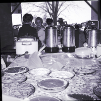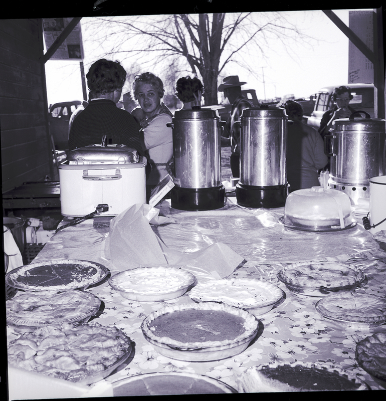 Warm pies, coffee pots, and a crock pot crowd a table in a makeshift cafeteria inside a shed on the Howard Lapray farm north of Filer. The Cedar Draw Community Club provided pie, hot coffee, and hamburgers to more than four-hundred people who attended the farm sale. A group of men and women, parked cars, and trees are in the background.