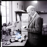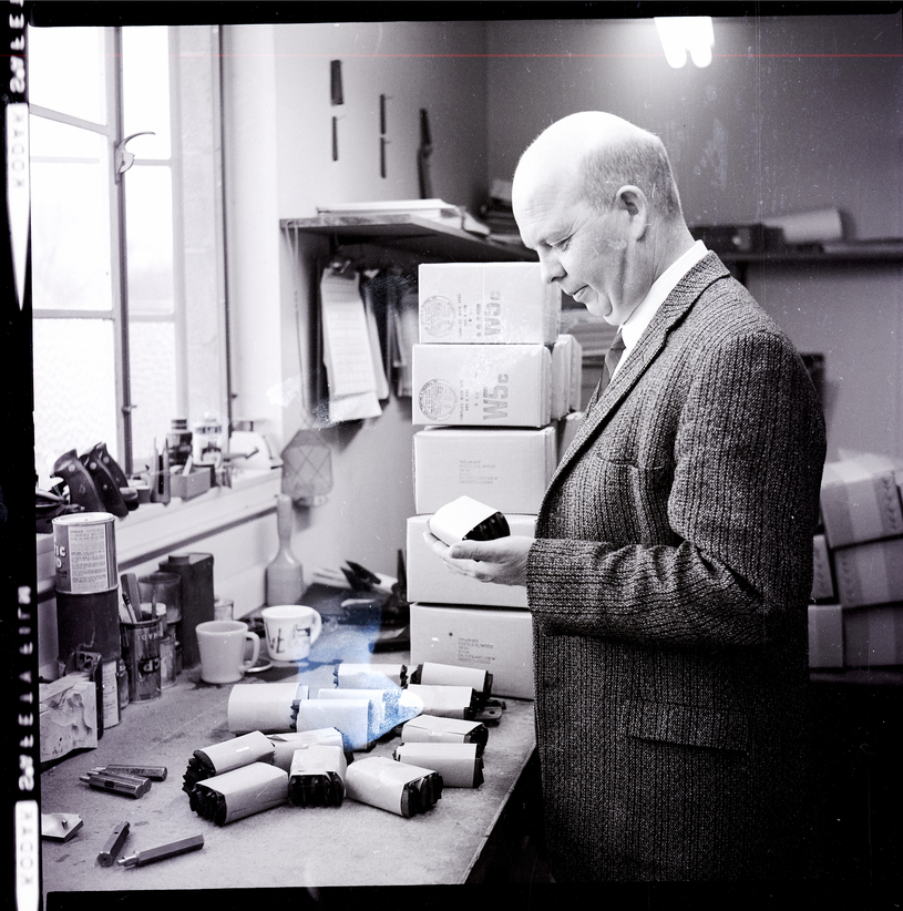 of wooden pistol grips for the familiar .45 caliber automatic pistol used by the army. After careful examination, Faulk found no substandard item in the order of 10,000 pairs of grips manufactured by Herrett's Handgun Stocks. He is dressed in a tie and jacket and holds a packet of grips. Many packets of grips and other boxes, cups, and supplies are on the work table in front of him. Shelves with binders on them line the room, and clipboards of paper hang from a wall.