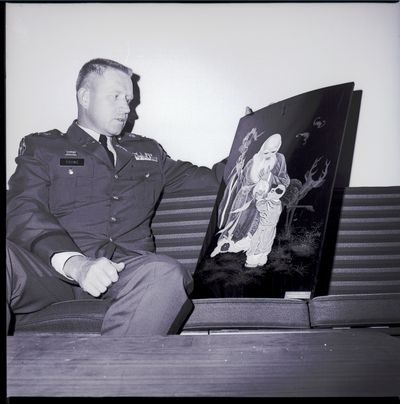 Captain Ray Young sits on a couch in his military uniform after returning to Twin Falls from the war in Vietnam after serving there for eleven months. On the couch beside him is a Vietnamese painting depicting an old man with a long beard holding a staff, a young boy holding a peach, and a deer. The painting was a gift from Captain Dinh, a Vietnamese air force pilot, whose father was one of three engineers aboard a train which was blown up by Viet Cong and taken by the enemy to the town of Muong Maun. Capt. Young, Capt. Dinh, and a helicopter crew flew into the area and brought the three engineers to safety. He received the painting as a reward during a party given by a Vietnamese fighter squadron.