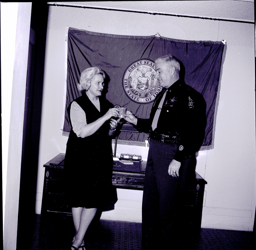 Toasting the New Year with a cup of coffee is Idaho State Police Lt. Dean Bennett and Mrs. Wiley Dodds. The State Police, District 4, will give free coffee and chewing gum to all motorists stopping at Cottrell and Hollister Ports of Entry, in an effort to prevent accidents caused by drinking. Behind them is a desk, and on it are a lamp, Post-It notes, and a three-ring binder hole punch. Hanging on the back wall is the Idaho state flag.