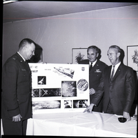New Wing Commander at the Mountain Home Air Force Base, Col. Robert Williams, left, points out topics of his talk on RF-4C imagery to Col. Rudy Ashenbrener, commander of the 9430th Air Reserve Squadron, and Lt. Col. Harry LeMoyne, president of the Magic Valley Chapter of the Air Force Association, at an Air Force Association meeting held in Twin Falls. The poster shows the different locations of the sensors on the aircraft, and several photographs taken from the aircraft. Col. Williams and Col. Ashenbrener wear their military uniforms, and Lt. Col. LeMoyne is dressed in a suit and tie. Behind the men are framed illustrations of flowers hanging on the wall. The poster is sitting on a table covered in a white tablecloth and with an ashtray on it.