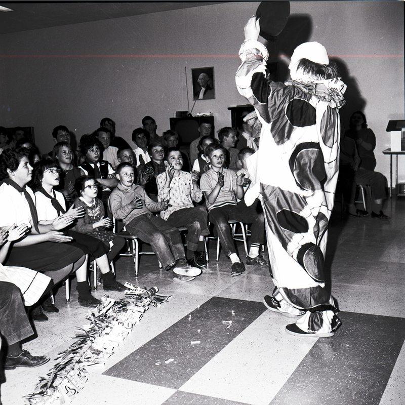 Tony Laughton, brother of late actor Charles Laughton, performs a benefit show sponsored by the Twin Falls Jaycees at Robert Stuart Junior High for students of the special education class. He is dressed as a clown, and stands in front of an audience of young children sitting on chairs and clapping their hands. A television is pressed against the side wall, and a framed image of President George Washington hangs on the wall above it.