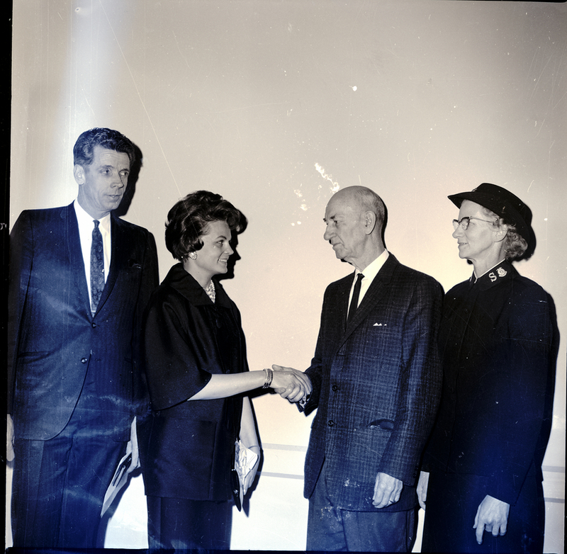 Probate Judge Zoe Ann Shaub, second from left, and Judge O. P. Duvall, third from left, shake hands after Judge Shaub was reinstalled as chairman of the Salvation Army Advisory Board. At left is Rev. R. Lewis Graham, special speaker at the annual meeting, and at the right is Salvation Army Major Marie Anderson. The men are wearing suits and ties, Judge Shaub is wearing a dress suit, and Major Anderson is wearing a Salvation Army uniform.