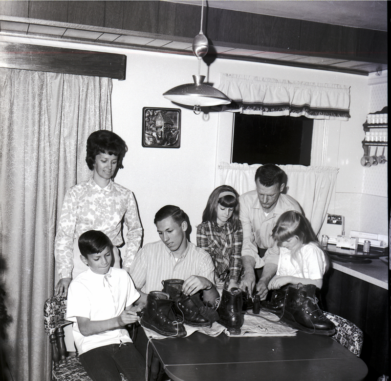 Mr. and Mrs. Larrey Anderson and their four children, Larry Anderson, Mark Hiedeman, Cherie Anderson, and Mary Ann Anderson, are seated around a dining table polishing shoes on top of some old newspapers. A picture of a house with a water mill hangs on the wall behind them. To the side is a long kitchen counter, and on the wall above it is a spice rack and some hanging measuring cups. Mrs. Larrey Anderson will represent the Magic Valley in the Mrs. Idaho competition to be held in Pocatello. The local contest was sponsored by KLIX Radio Station and Gold Strike Stamps.