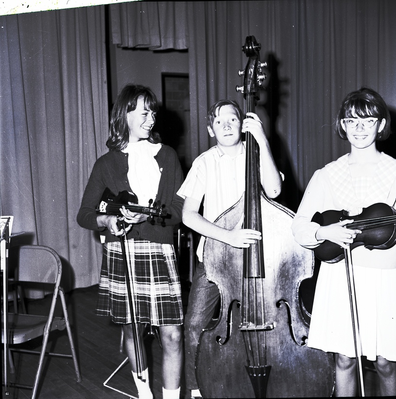 Two-hundred and fifty young musicians will present a program of orchestra music at the Robert Stuart Junior High School Gymnasium. Two of the young musicians are, from left, Mary Ann Babbel, violinist, and Wayne Forey, bass viol. To their right, a girl in a dress holds a violin. A folding chair and a music stand are to the side, and long auditorium curtains hang behind them.