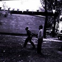 - Two men throw horseshoes at the Twin Falls County Fair. One of the men is wearing a bowler hat. Behind them is a brick wall, and pennants hang from a banner above them. In the distance are some trees and parked cars.