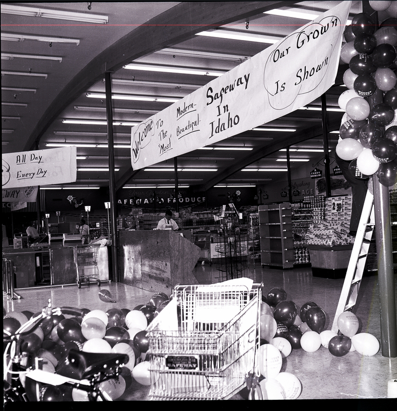 Dick Anderson, merchandiser, stands on a ladder hanging a string of balloons from a banner at the Safeway grand opening. The banner reads "Welcome to the 'Most' Modern, Beautiful Safeway in Idaho, Our Grown is Shown." In the foreground are piles of balloons and a shopping cart. Isles of groceries and cashiers are in the background. A sign over the checkout counters reads "All Day Every Day."