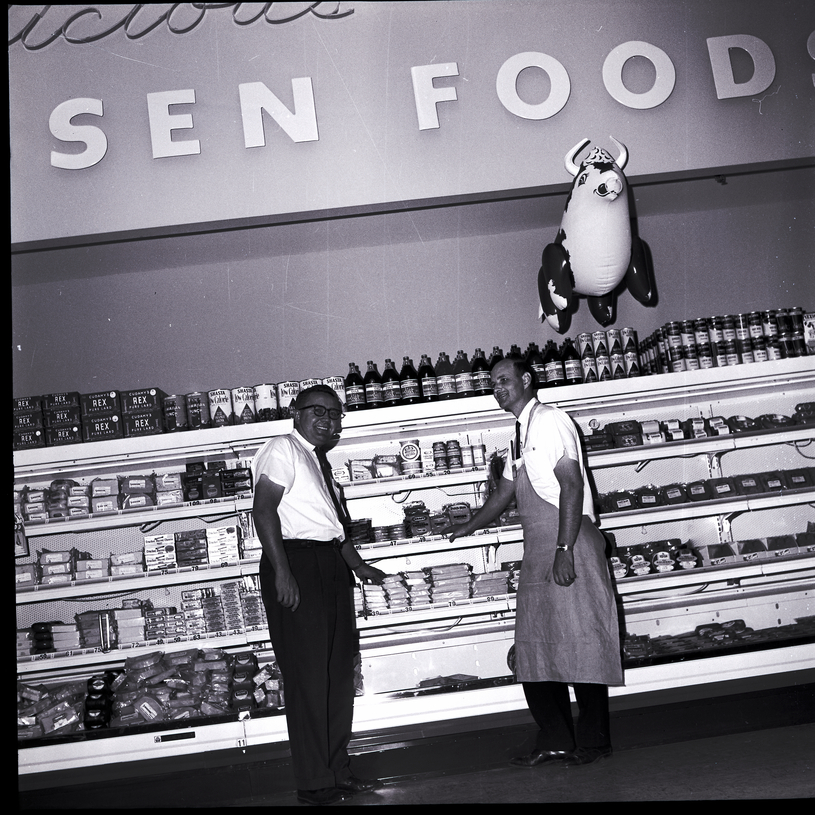 - Two men stand in front of some refrigerated shelves of food at the Safeway grand opening. One of the men is wearing a long apron. An inflatable cow hangs from ceiling above them.