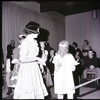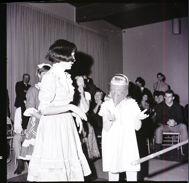 Punky Smith is blindfolded with a bandanna and holds out her hands for a stick to try to break a pinata at a Mexican posada held at the YM-YWCA building for host families of eleven Mexican youths visiting Twin Falls as part of the Experiment in International Living program. Christina Puga, dressed in a Mexican dress, stands beside her. Several attendees are gathered around the sides of the room, watching.