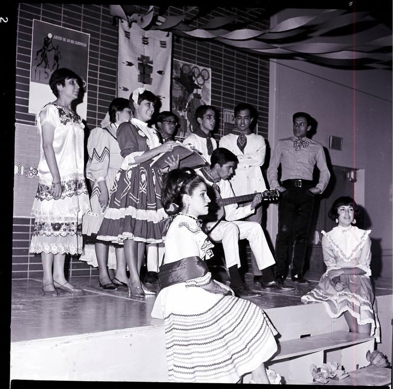 A group of people, dressed in Mexican clothing, stand on a stage and sing at a Mexican posada held at the YM-YWCA building for host families of eleven Mexican youths visiting Twin Falls as part of the Experiment in International Living program. One girl holds a songbook, and a boy plays a guitar. Two girls sit on the edge of the stage in Mexican dresses, singing. Several posters are on the wall behind them, and streamers decorate the ceiling.