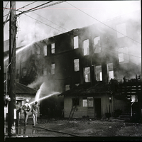 Tongues of flame lick through windows and smoke billows up from the Lincoln Inn in Gooding as fire fighters pour streams of water onto the building, to keep the fire from spreading. The Cellar Bar Club and Gooding County Court House offices in the building were also destroyed in the fire.