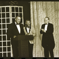 Three men dressed in suits and tow ties stand on stage at the Filer High School auditorium during an awards ceremony after the opening night performance of the Dilettante's production of "The Sound of Music." Behind the podium is Duke Wiseman, principal at O'Leary Junior High School. A lattice and a long drape decorate the stage behind them.