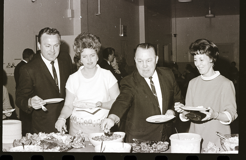 The buffet table is an inviting setting for Mr. and Mrs. Pat Hamilton, left, and Mr. and Mrs. Rex Engelking during the recent dinner-dance at the Buhl National Guard Armory hosted by the Exemplar Chapter, Beta Sigma Phi, as the first of several planned events to raise money to match funds available for expansion of the Buhl Public Library and improve lighting at the high school football field and city softball park. On the table is a tray of meat, bowls of salad, a vegetable platter, and a stack of paper plates. Other party attendees are seen dining or visiting in the background.