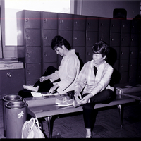 Two women sit on some benches changing into their bowling shoes at the Magic Bowl in Twin Falls, where the 25th Idaho State Woman's Bowling Association Tournament was held. Behind them is a wall of lockers. On the ground beside the bench is a bowling ball bag.