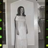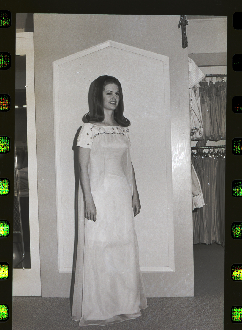 Mrs. Donald Egbert models a white dress from the Idaho Department Store for the Jay-C-Ettes annual fashion show. A mirror hangs on the wall beside her. To the side of the room, clothing hangs on hangers.