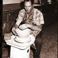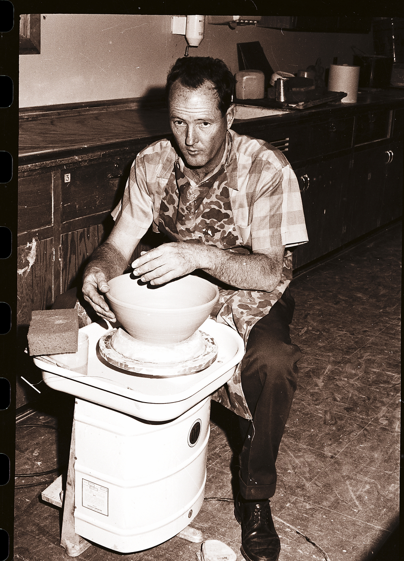 CSI student Robert Grubbs makes a pottery bowl on a spinning wheel for the art show to be held during CSI's Festival of the Art. Behind him is a long counter, and several kitchen appliances and utensils sit on top of it.