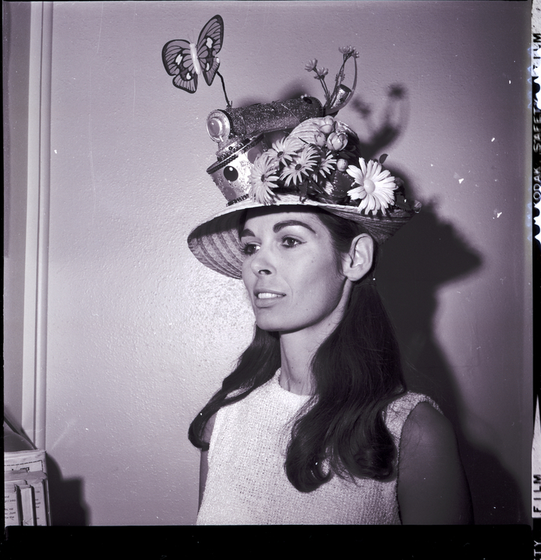 Carol Serpa wears a wide-brimmed hat covered in plastic flowers, a crown, a kaleidoscope, and a butterfly. The hat was homemade for Easter and worn during the Ladies of the Elks hat parade.