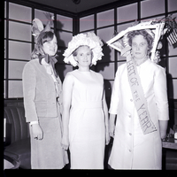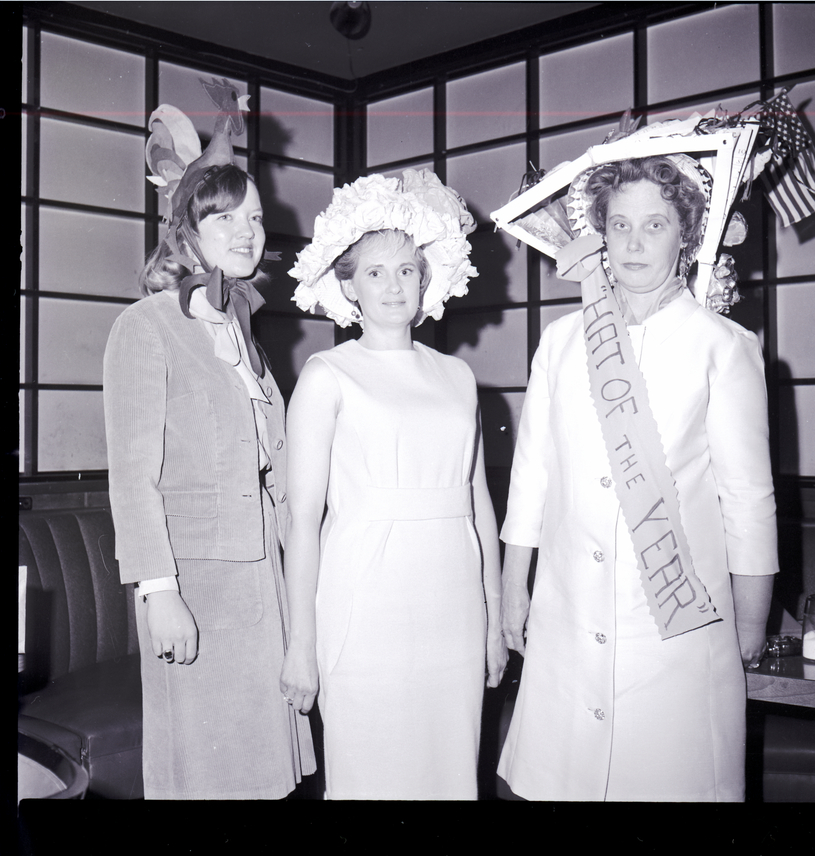 Three women model hats for the Welcome Wagon Newcomers Club hat luncheon held at Kay's Supper Club. The woman on the left wears a hat that looks like a hen tied to her head with a ribbon, Rita Bradley, center, wears a hat of white flowers and ruffles, and the woman on the right wears a bonnet covered in picture frames, newspapers, an American flag, and a banner reading "Hat of the Year."