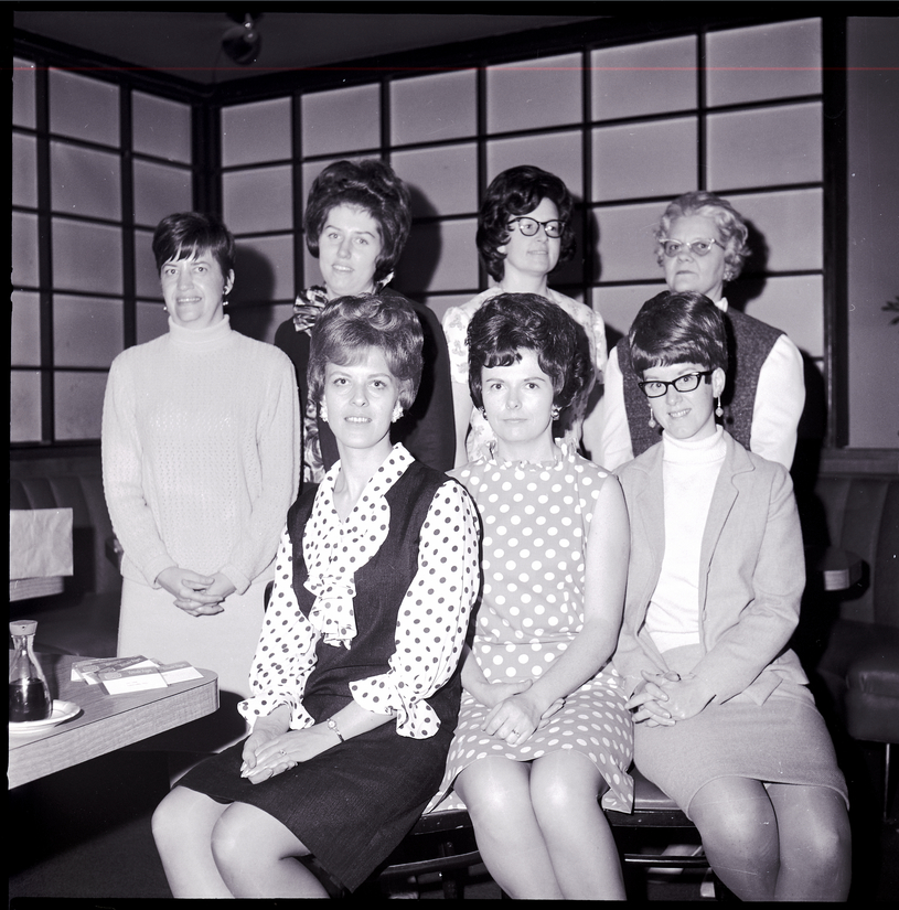 Officers for the Welcome Wagon Newcomers Club pose at a hat luncheon held at Kay's Supper Club. To the side of the group of seven women is a table with Welcome Wagon name cards and a bottle of soy sauce on it.