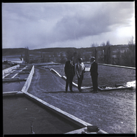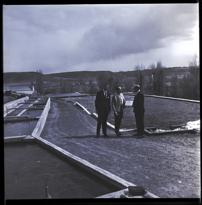 Robert Erkins, owner and operator of the Snake River Trout Company trout farm, is presented an Industrial Indemnity Company Safety Award. Don Elliot, left, and Dan Obenchain, right, hand him the award certificate. On either side of them are several trout hatching ponds. Trees and hills stretch out into the distance.