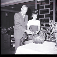 H. E. Cheney serves punch to Murray Clements at a social for Magic Valley Baseball Queen candidates held at Kay's Supper Club in Twin Falls. Miss Clements is sponsored by the Twin Falls Elks Lodge. Mr. Cheney is wearing a suit and tie and Miss Clements is wearing a dress. On the table in front of them is a crystal punch bowl and an arrangement of flowers. Behind them is a lattice and some plants. A dining room is in the background.