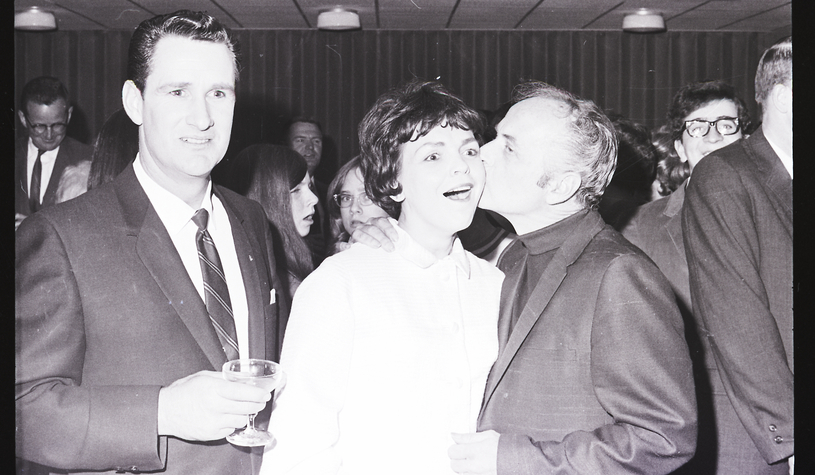 H. Paul Kliss, director of the show, kisses Mrs. David Mead, lead actress, on the side of the cheek at the Dilettante's "Sound of Music" opening night champagne dinner, held prior to the show at the Twin Falls Holiday Inn. Roger Vincent, lead actor, stands beside them, holding a glass of champagne. Other attendees visit with each other in the background.