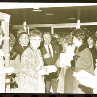 A group of people stand in a foyer of the Filer High School auditorium to see the opening performance of the Dilettante's production of "The Sound of Music." Several attendees are holding programs in their hands. Henry Wills is in the center of the group, dressed in a suit and tie.