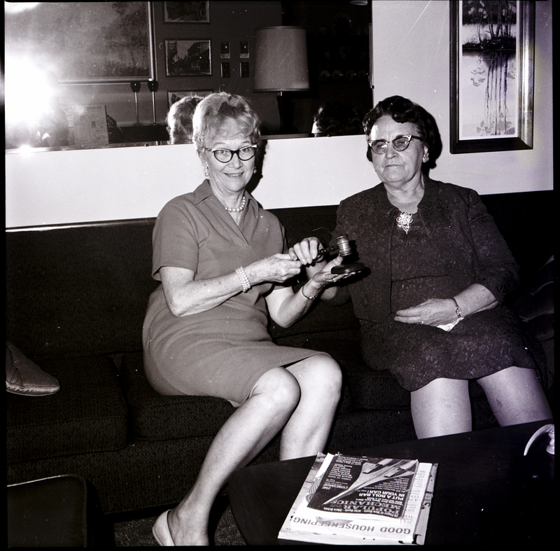 From left to right, Mrs. Bessie Harrison, past president of the Beta Sigma Phi Beta Theta Chapter, hands Mrs. Ina Knox, new president, a gavel. The two women are seated on a couch, and on the table in front of the couch is a stack of magazines. On the wall behind them is a mirror and a framed picture.