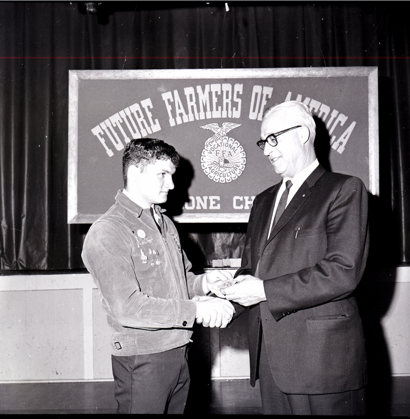Russell Hall, district FFA advisor, hands an award pin to Clarence Tews, outgoing president of the Shoshone FFA chapter, during the FFA Parent-Son Banquet. Clarence Tews is wearing his FFA jacket, and several pins are on the front of it. He received the leadership award, livestock farming foundation award, and the chapter's star farmer award. Behind them is a stage and above it a large sign reads "Future Farmers of America Shoshone Chapter."