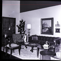 A display of furniture is seen inside of L'Herisson's furniture store during its grand opening. In the display is a couch, several chairs, a round wooden table, a round glass table with a telephone on it, a coffee table with a statue, decorative plate, and magazines on it, and a side table with a picture frame and lamp on it. Against the back wall is a cabinet with glass doors with various home decorations inside it. A plant sits in the corner, and a painting and some wall ornaments hang over the couch.