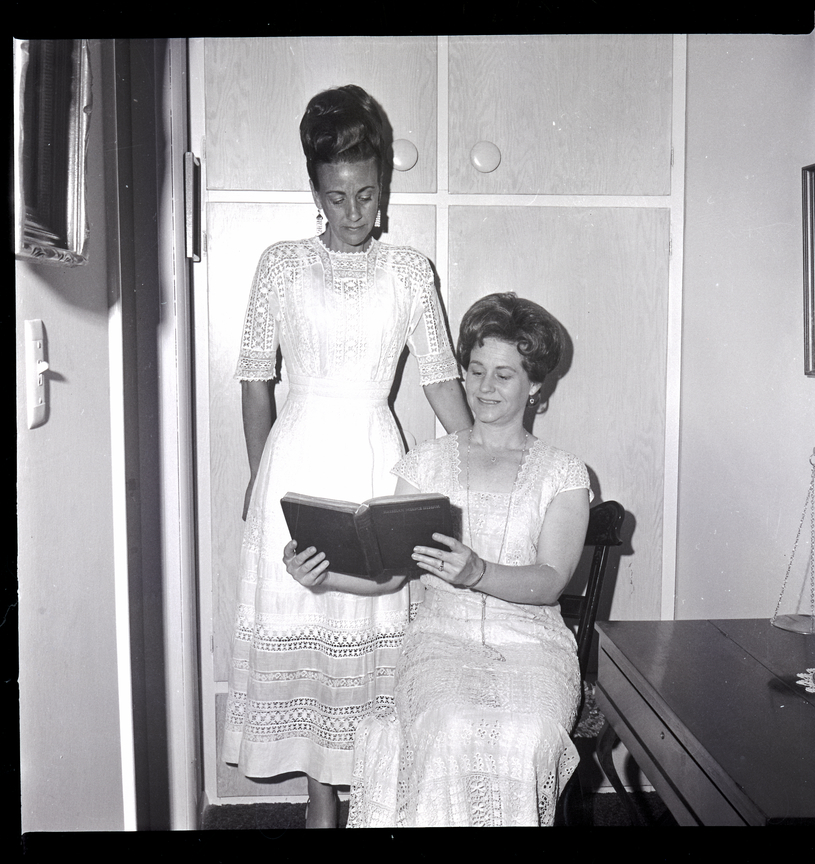 - Two women model white dresses for the upcoming Twin Falls Rotary Club anniversary dinner-dance held at the Blue Lakes Country Club. They look at an old book, and the front cover of the book reads "Kristian Science Hymnal."