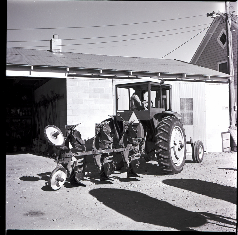 - Kenneth Poe sits behind the wheel of a piece of farm equipment. Behind him is a garage, and several shovels hang on the side wall.