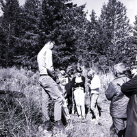- A man talks to a group of Minidoka and Cassia County sixth graders about wildlife during a conservation tour of Howell Canyon. He stands beside a sign that reads "Wildlife" as a group of children stand around him, listening. Trees and wild grass surround the area.