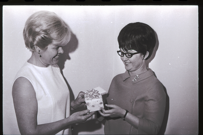 - Alpha Nu chapter members Mrs. Maurice Fuller, right, presents Mrs. Mark Wilkie a small wrapped present as a "Girl of the Year" award during the Epsilon Sigma Alpha Founder's Day celebration.