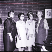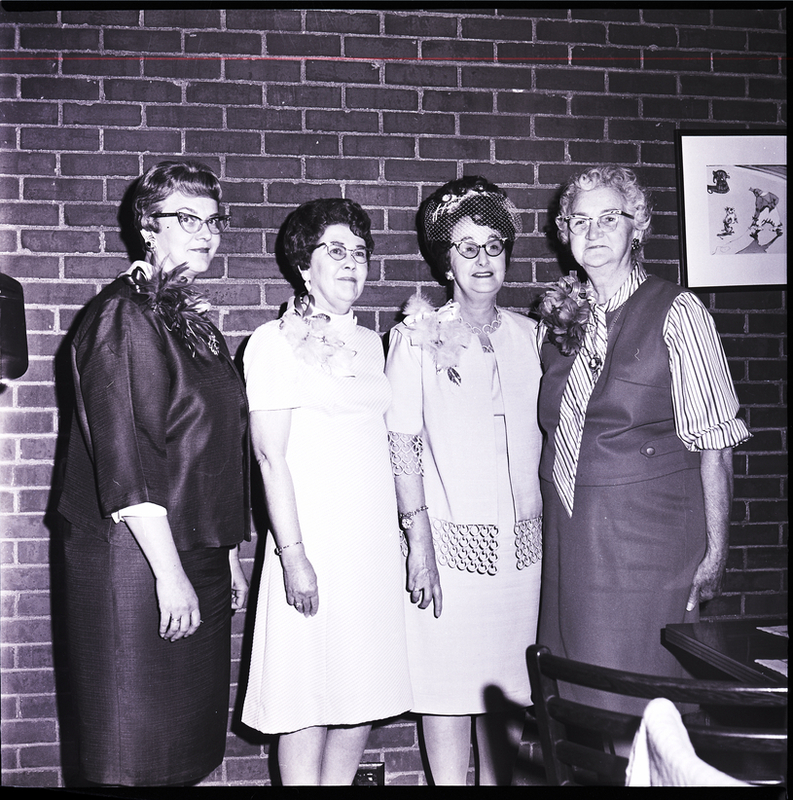 New officers of the Goodwill Club were installed and presented corsages during a luncheon and installation service held at the Depot Grill. From left to right are Mrs. Claude Severt, treasurer; Mrs. William Owens, secretary; Mrs. Gene Tyner, vice president, and Mrs. Ed Orndorif, president. To the right is a dining table, and a picture hangs on the brick wall behind them.