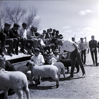 FFA members display their sheep at the East Magic Valley FFA District Livestock Contest held at the Jim Brooks Ranch in Hazelton. Jim Olsen walks down the line, explaining the proper way to judge sheep. A large group of FFA members sit on a sloped pen roof watching the judging.