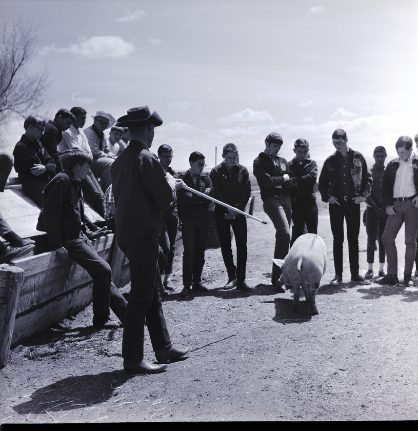 - Bob Loucks, Camas County agent, explains how he judges hogs at the East Magic Valley FFA District Livestock Contest held at the Jim Brooks Ranch in Hazelton. A group of FFA members surround the scene. Several members sit on a sloped pen roof, watching the hog.