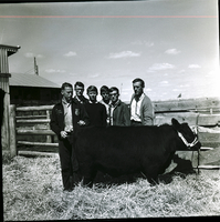 KEL 878 The top team in the recent East Magic Valley FFA District's livestock judging contest held at the Jim Brooks Ranch in Hazelton was the Oakley team. From left to right are Chris Baker, Dean Clark, Bill Anderson, Keith Adams, Steven Smith, and J. R. Swan, instructor. The team stands behind a bull. Behind them is a fence, and a barn is in the background.